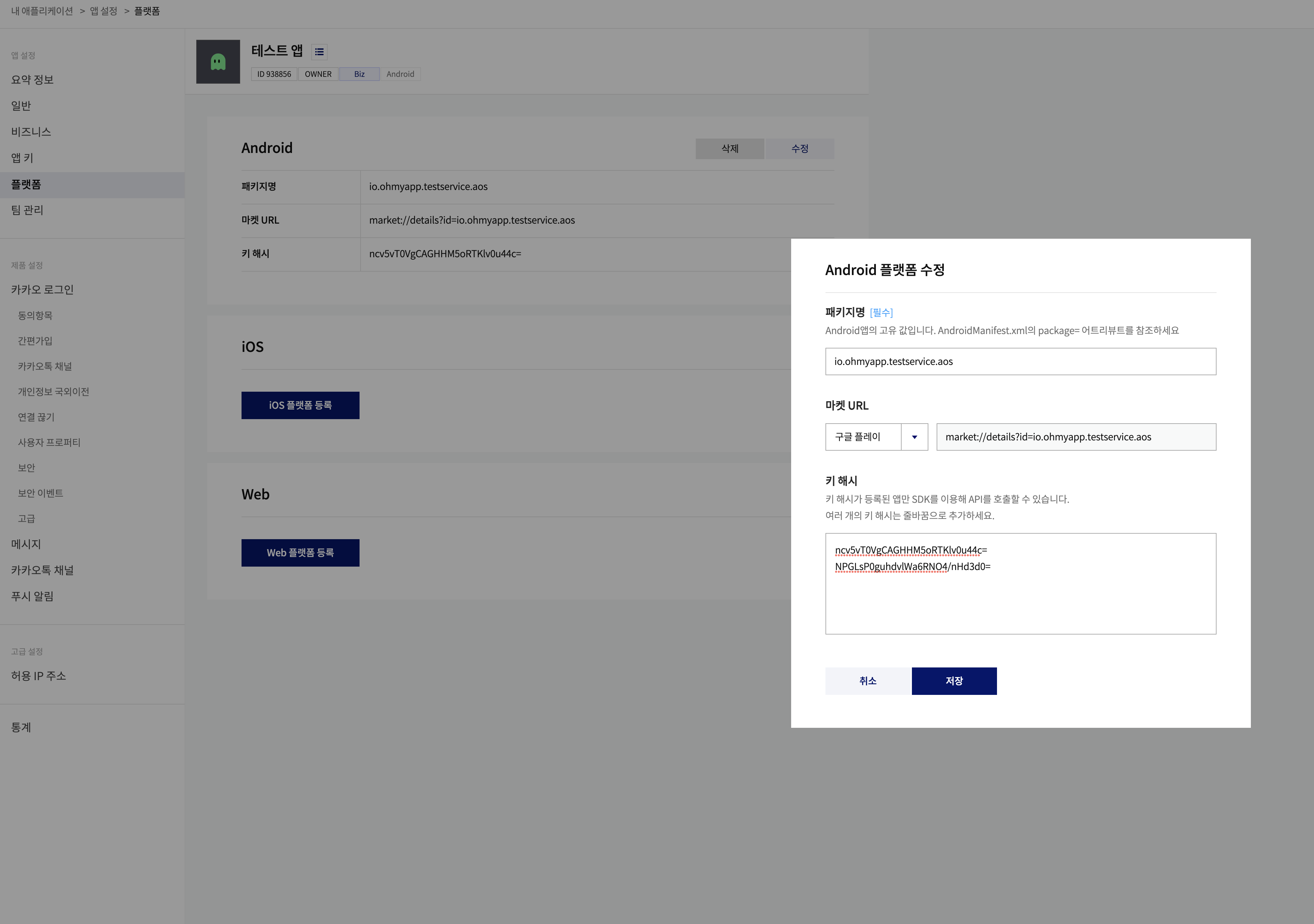 10. [**카카오 소셜 로그인 설정**](https://docs.ohmyapp.io/main/guide/deploy/googleplay/option/kakaologinlink)을 연동한 경우 오마이앱 환경 설정으로 이동하여 서명 키 해시 추출 버튼을 클릭하여 키 해시를 추출 후 복사해 주세요.