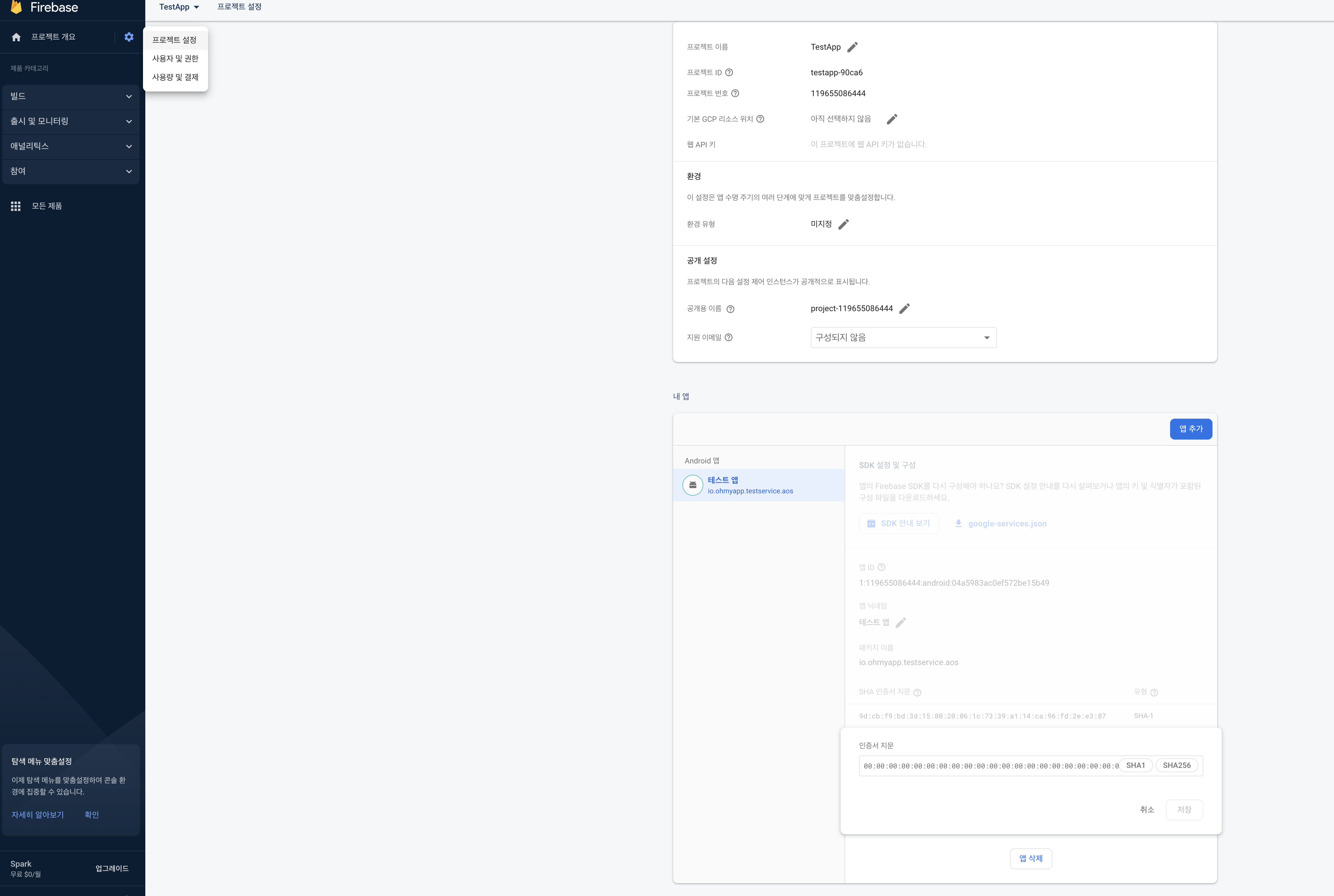 9. FireBase > 프로젝트 설정 하단 > 디지털 지문 추가를 눌러 복사한 sha-1 인증서 지문을 붙여넣고 저장해 주세요.