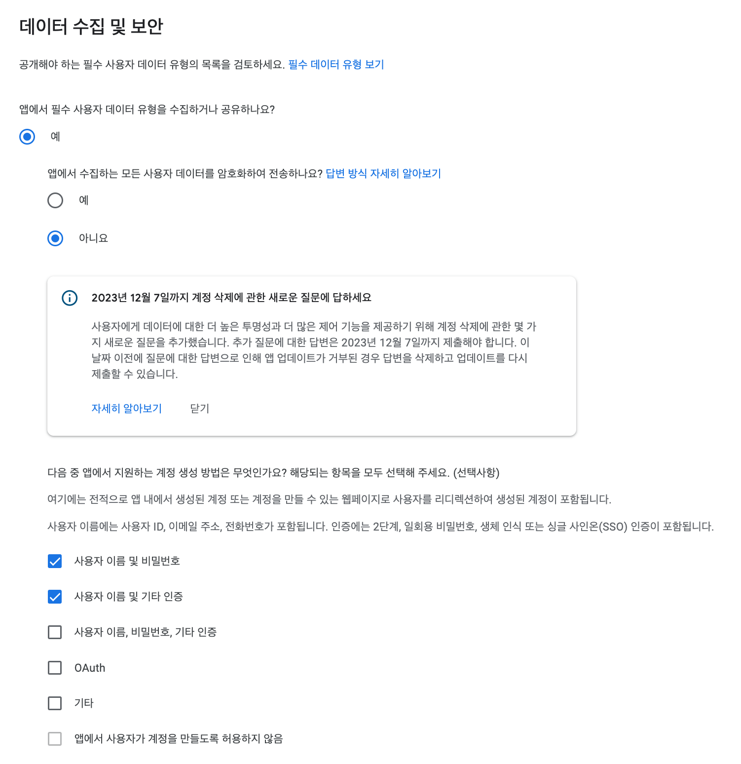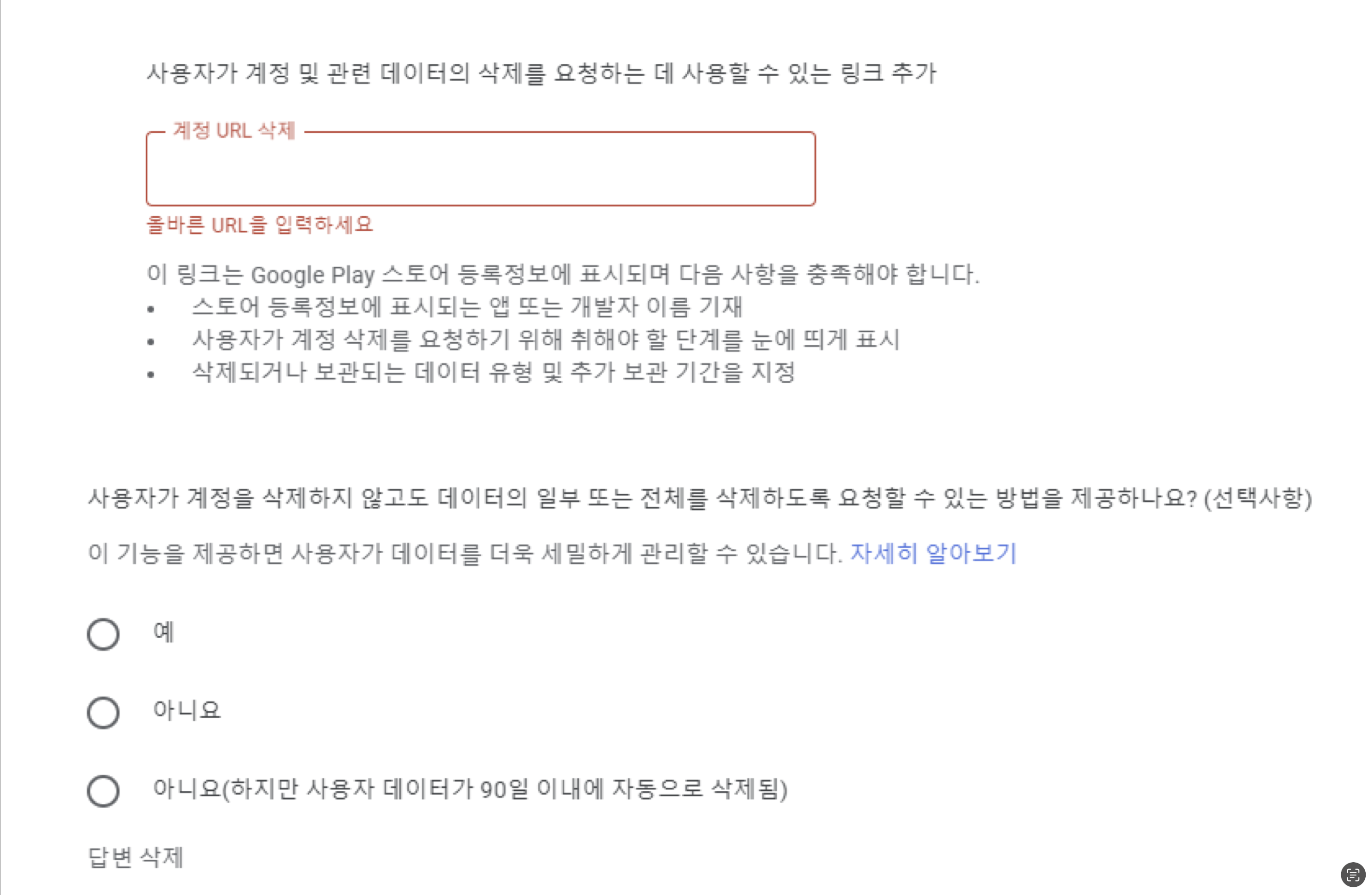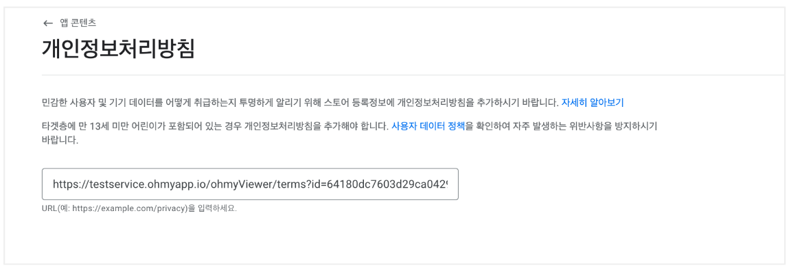 **사용자가 계정 및 관련 데이터의 삭제를 요청하는 데 사용할 수 있는 링크 추가** 항목에 [**개인정보처리방침/이용약관**](https://docs.ohmyapp.io/main/guide/deploy/undefined/undefined)에서 준비한 이용약관에 회원 탈퇴 기능이 있는 화면에 대한 설명을 추가하고 서비스 이용약관의 링크를 입력해 주세요.