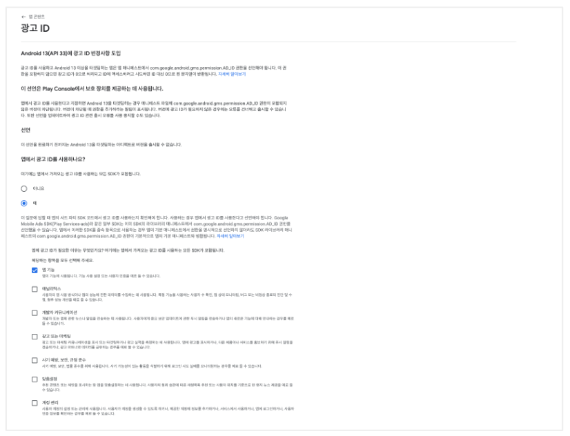 10. 광고 ID에서 선언 시작 버튼을 클릭해 아래 스크린샷과 같이 체크 후 저장해 주세요.
