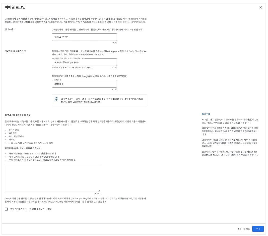 1. 로그인을 필수로 요구하거나 비로그인 유저가 기능을 제한받는 경우 '전체 또는 일부 기능이 제한됨' 을 체크 후 심사용 계정 정보를 제공해야 해요.