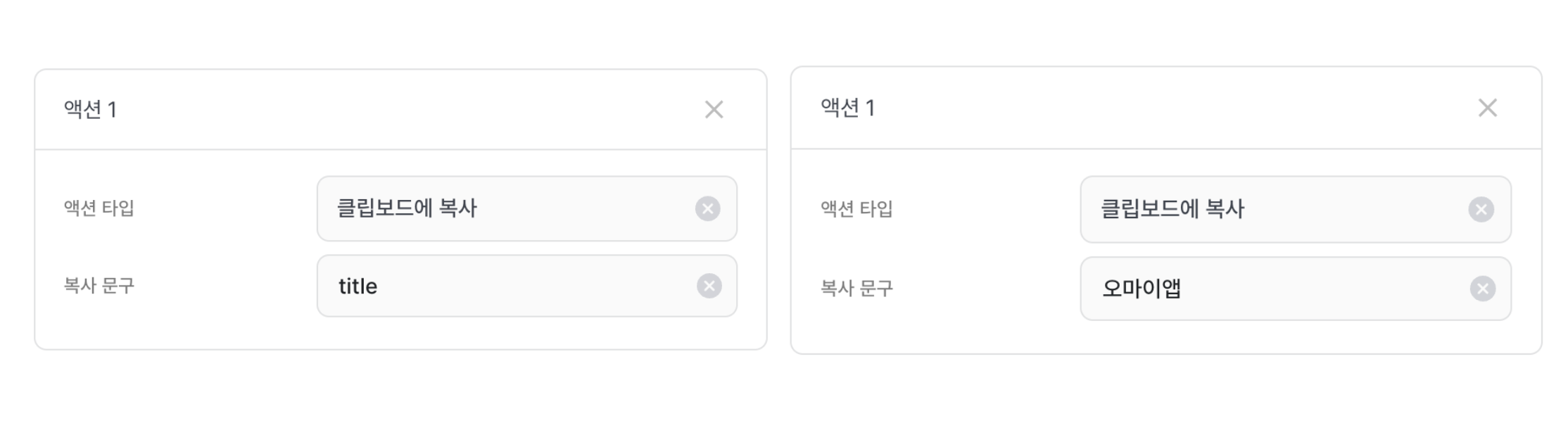특정 문구를 복사하고 싶을 때 **클립보드에 복사(clipboard)** 액션을 활용해요.